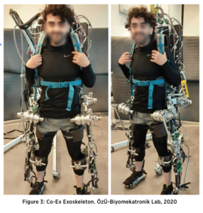 2015 yılında Özyeğin Üniversitesine katıldığımda da Türkiye’yi exoskeleton teknolojisi konusunda lider ülkelerden biri haline getirmeyi amaçladım. ATR’da geliştirdiğim dış iskelet robot sadece sagital (ön-arka) eksende özdengeleme sağlayabiliyordu. Kuruma katılmamla beraber TÜBİTAK 1001 programına yaptığım başvuru kabul edildi. Bu proje kapsamında kuvvet kontrollü özel eyleyicilere sahip, her eksende kendi kendini dengeleyebilen Co-Ex (Compliant Exoskeleton for human-robot Co-Existence; bkz. Şekil 3) adlı exoskeletonu geliştirdik. 2020’de tüm fonksiyonel testlerini tamamladık; bu testler literatürde yerini aldı ve sistem de ayrıca patent koruması altına alındı (Coruk vd., 2020 Yıldırım vd., 2026, Soliman vd., 2024). Laboratuvarımdaki exoskeleton çalışmaları iş arkadaşlarımla ortak bir şekilde farklı evrim çizgilerinde devam ettiriliyor.
