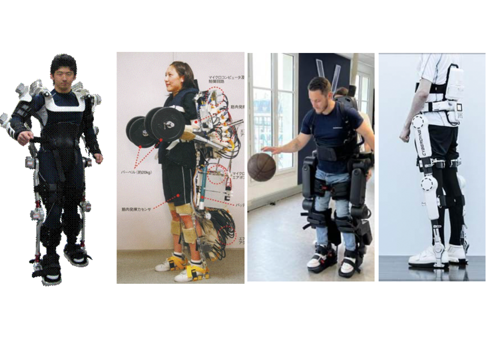 Şekil 1: Örnek dış iskelet sistemler: Soldan sağa; TTI-Exo (Ugurlu vd., 2020), Power Assist Suit (Ishii vd., 2005), Atalante (Vigne vd., 2020), Cyberdyne HAL (Tsukuhara vd. 2010)