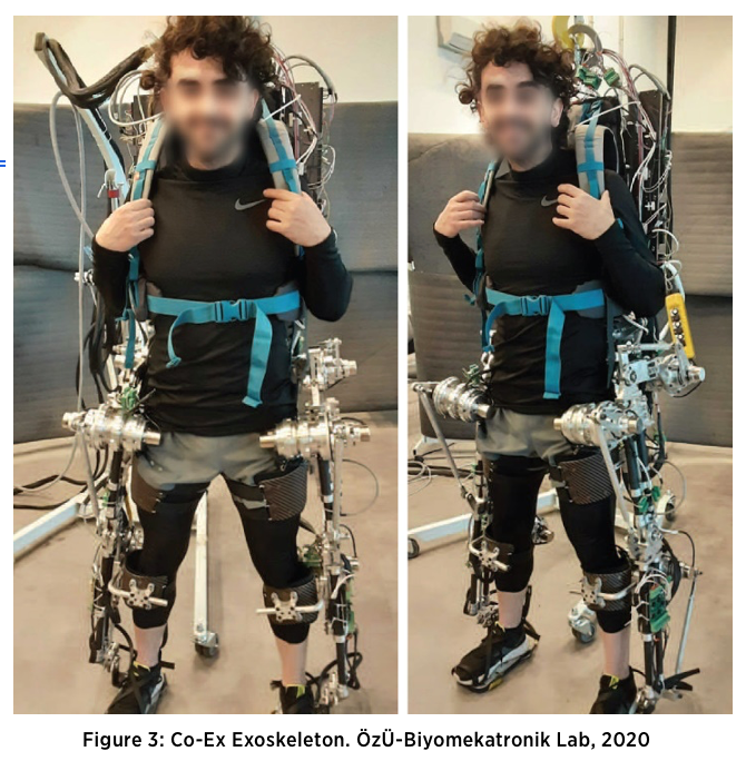Within this project, we developed Co-Ex (Compliant Exoskeleton for Human-Robot Co-Existence; see Figure 3), an exoskeleton equipped with force-controlled custom actuators capable of maintaining balance along all axes. By 2020, we had completed all functional tests. These results were published in the literature, and the system was also protected by patents (Coruk et al., 2020; Yıldırım et al., 2026; Soliman et al., 2024).